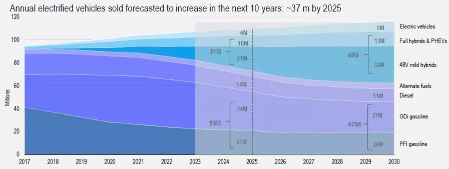 圖1:電動(dòng)汽車(chē)市場(chǎng)(包括純電動(dòng)汽車(chē)和混動(dòng)汽車(chē))預(yù)計(jì)在未來(lái)幾年會(huì)迅速增長(zhǎng),48V的采用將成為有利于增長(zhǎng)的一個(gè)要素(:Delphi科技)
