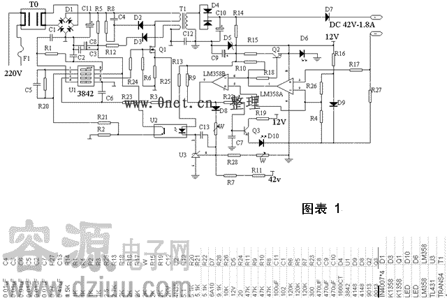 常用電動(dòng)車充電器根據(jù)電路結(jié)構(gòu)可大致分為兩種。第一種是以uc3842驅(qū)動(dòng)場(chǎng)效應(yīng)管的單管開(kāi)關(guān)電源,配合lm358雙運(yùn)放來(lái)實(shí)現(xiàn)三階段充電方式。其電原理圖和元件參數(shù)見(jiàn)(圖表1)