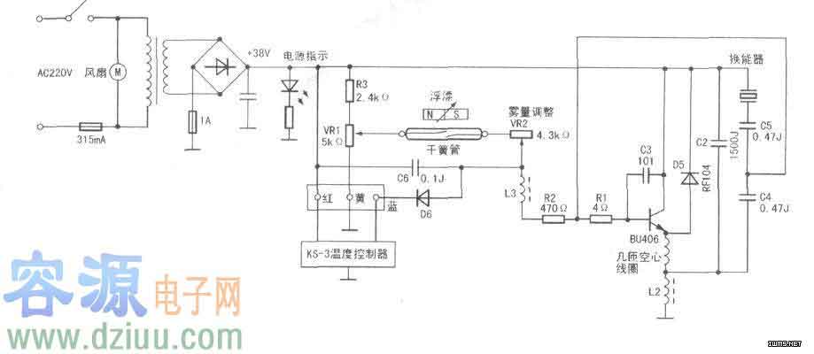 該機還設有無水保護電路。BU406的偏置電路為:電源+38V→R3→VR1→干簧管→VR2→L3→R2→R1。其中,干簧管置于水池中的一個豎直的空心立柱內,立柱上套有一個環形浮漂,漂內為永久性磁鐵。加水后,水池內帶磁鐵的浮漂受浮力的作用,上升到立柱的中腰處,即為柱內干簧管的半中腰處。干簧管兩簧片閉合,BU406偏置電路接通,加濕器正常使用。如水耗干,浮漂落下,干簧管兩簧片斷開,偏置電路斷路,則電路停振,達到保護BU406與換能器的目的。