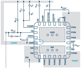 根據其中一種觀點,開關穩壓器 IC 上的 AGND 和 PGND 連接應該在各自引腳旁相互連接。這樣一來,兩個引腳之間的電壓偏移保持在相對較低的水平。因此可以保護開關穩壓器 IC 免受干擾,進而免遭破壞。電路的所有接地連接和可能的接地層將以星型拓撲的結構連接到該公共點。