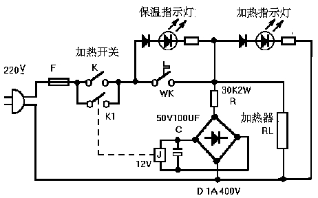電源接通后,按下加熱開關(guān)K,電路接通,開始加熱。