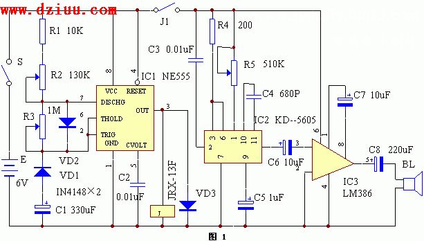 外圍阻容元件、二極管等組成。它是一個占空比可調的脈沖振蕩器,其占空比由R2和R3控制。貓叫聲發生電路由一塊CMOS集成電路IC2 KD-5605擔任,