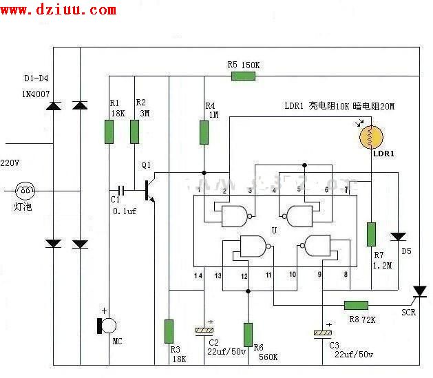 集成塊了MC14011,LDR1用光敏電阻,電路圖如下:本文由www.mnu8.com整理提供,部分內(nèi)容來(lái)源于網(wǎng)絡(luò),如有侵犯到你的權(quán)利請(qǐng)與我們聯(lián)系更正。