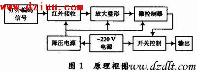 智能紅外遙控開關主要由紅外接收、放大整形、微控制器、開關控制以及降壓電源等模塊組成,其原理框圖如圖1