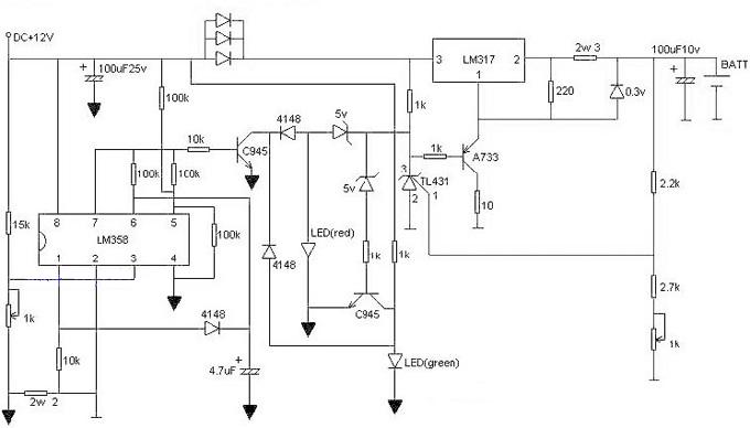 充滿。只要您有12V的電源就可以,本電路我自己在汽車上應用,將點煙器的線路接出來,就可以實現充電,接完電路后先別裝電池,調右下角的可調電阻,使電池輸出端為4.2V,再調左下角的可調電阻使lm358第三腳為0.16V就可以了,充電電流為380mA,超快,三個并連的二極管是降壓的,防止LM317過熱,且LM317須加散熱片,圖中的三極管可以任意型號。