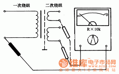 2)檢測各繞組間、繞組與鐵心目的絕緣電阻萬用表置于Rx1Ok擋,將一支表筆接一次繞組的一引出線,另一表筆分別接二次繞組的引出線,萬用表