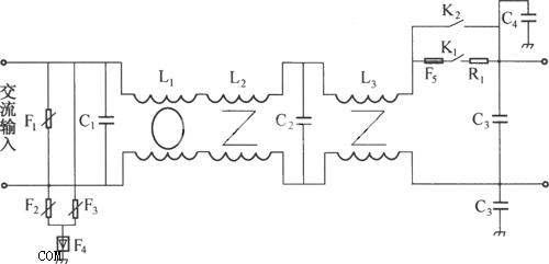 DMA12單相交流電壓經由C3、L3和C1、L2、C2構成的兩級差模濾波網絡和由與機殼相連的C4、C5和共模電感L1構成的一級共模濾波網絡,進行EMI濾波,使EMI濾波后水平輸出符合VDE0871 A標準。