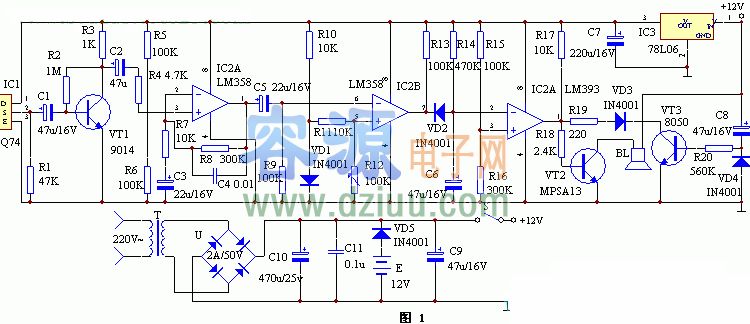 IC4的②腳變?yōu)榈碗娖,它與IC4的③腳基準(zhǔn)電壓進(jìn)行比較,當(dāng)它低于其基準(zhǔn)電壓時(shí),IC4的①腳變?yōu)楦唠娖剑琕T2導(dǎo)通,訊響器BL通電發(fā)出報(bào)警聲。 <<版權(quán)聲明:本文由容源電子網(wǎng)(www_dziuu_com)整理提供,部分內(nèi)容來(lái)源于網(wǎng)絡(luò),如有侵犯到你的權(quán)利請(qǐng)與我們聯(lián)系更正!