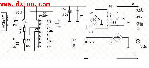,電路左邊A B端為單線進出端,和負載串聯后接在220V市電上。集成塊CD4017 接成雙穩態觸發電路,用來控制單向可控硅;SCR