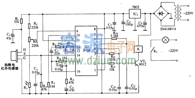 當熱釋電紅外傳感器檢測到人體紅外信號時,它將輸出微弱的電信號至lC。的⒁腳,經IC1內部兩級放大器放大后,再經電壓比較器與其設定的基準電壓進行比較,然后輸出高電平,經延時