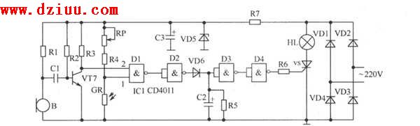 一塊2輸入端四與非門CD4011數字集成電路。VS為MCR100-8型等小型塑封單向晶閘管。 <<版權聲明:本文由容源電子網(www_dziuu_com)整理提供,部分內容來源于網絡,如有侵犯到你的權利請與我們聯系更正。》