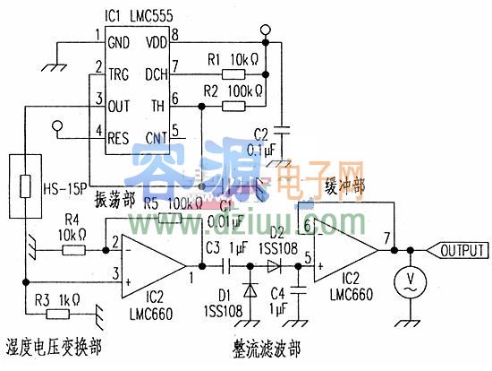 圖中驅(qū)動器的輸出,可以輸入到PIC單片機(jī)作濕度測定并顯示;還可以輸入到濕度控制器.