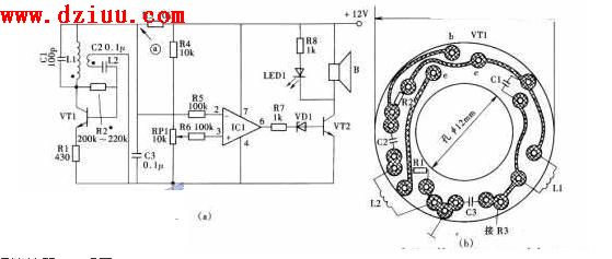 的環形印制板上。線圈L1用如。1mm漆包線在內徑為10mm的圓柱形變壓器骨架上密繞30匝,其外用同樣漆包線繞1匝