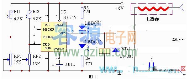 恒溫控制器由熱敏電阻Rt1、Rt2、NE555時基電路、溫度范圍
