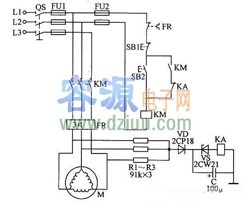該保護(hù)電路的保護(hù)作用如下:將3只電阻R1~R3接成一個(gè)人為的中性點(diǎn),當(dāng)電動(dòng)機(jī)斷相時(shí),此中性點(diǎn)發(fā)生偏移,繼電器KA得電吸合,繼電器的常閉觸點(diǎn)切斷接觸器KM線圈回路,KM失電釋放,電動(dòng)機(jī)主回路電路被切斷,電動(dòng)機(jī)M停轉(zhuǎn)。三角形聯(lián)結(jié)電動(dòng)機(jī)斷相保護(hù)電路: <<容源電子網(wǎng)論壇正式上線,為朋友們建立一個(gè)友好互動(dòng)交流平臺(tái),歡迎大家去論壇和朋友們一起分享、學(xué)習(xí)電子技術(shù)。對(duì)本文有什么疑問請(qǐng)直接到論壇相應(yīng)欄目發(fā)貼求助。