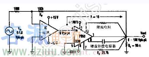 該高壓運算放大器采用了一只ApexPB50Rooster放大器和一只集成電路運算放大器。該電路把小的模擬信號變換成180Vyp信號。 :