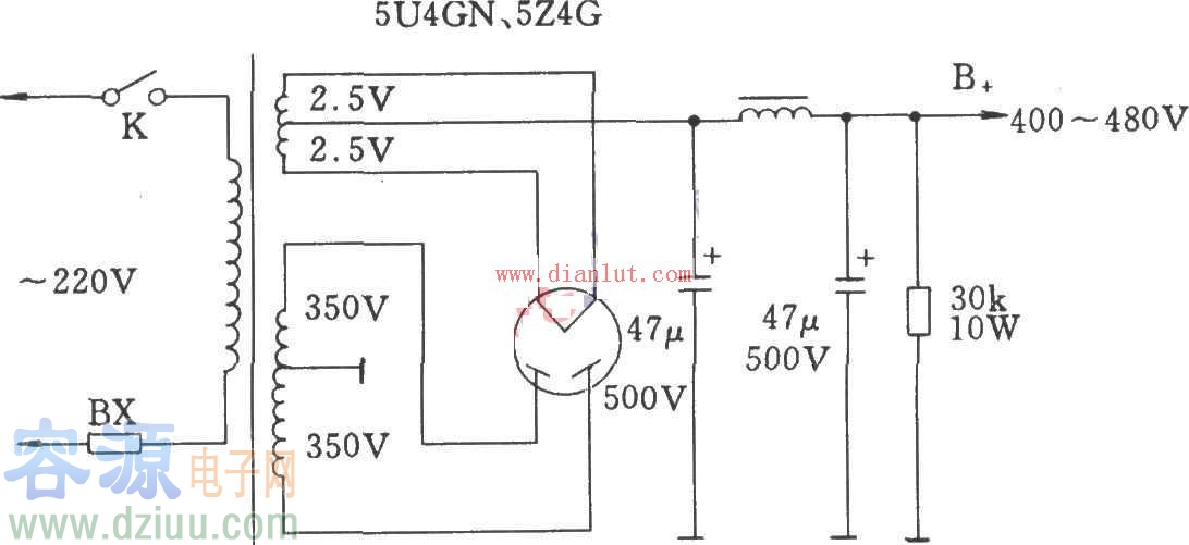 直熱式整流電子管燈絲抽頭高壓電路圖