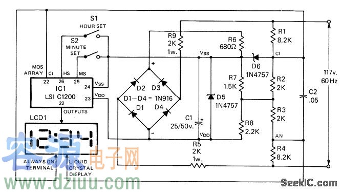 使用由大規(guī)模集成電路計算機系統(tǒng)做成的C1200時鐘電路具有時間設(shè)定,秒鐘、分鐘和小時分割,七段解碼,顯示驅(qū)動和開關(guān)的功能。四位液晶顯示面板是MGC-50。S1和S2以2Hz的速率提前設(shè)置分鐘或小時。為了使其能用作時間