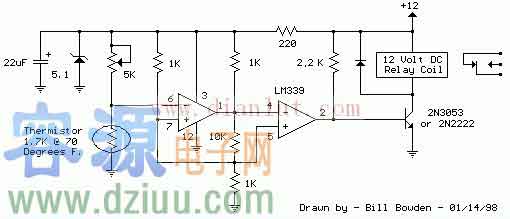 如圖所示是LM339設(shè)計(jì)的電子溫控器及繼電器電路的電路圖。 本電路是一個(gè)簡(jiǎn)單的自動(dòng)調(diào)溫器電路,可用于控制,通過(guò)繼電器觸點(diǎn)繼電器與供電的一個(gè)小空間加熱器。繼電器觸點(diǎn)的額定以上應(yīng)為