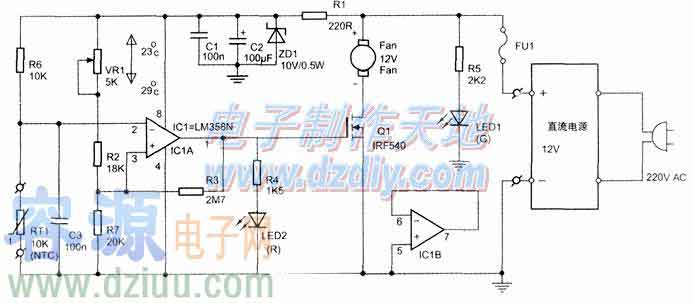 測溫電橋由溫度傳感器RT1與R6、VR1、R2、R7組成。IC1是一塊雙運(yùn)放lm358N,在這里只用了其中一運(yùn)放,接成帶滯后的電壓比較器。其同相輸入端加有VR1調(diào)定的基準(zhǔn)電壓,調(diào)節(jié)VR1就可以在控溫范圍內(nèi)設(shè)定不同的溫度;反相輸入端則加有R6與RT1的分壓,由于RT1的阻值是隨被測環(huán)境溫度變化而改變的,因此ICIA反相端電位也隨溫度變化而改變。MOSFET管Q1在ICIA輸出電平(L≈0V,H≈10.5V)的控制下對負(fù)載散熱風(fēng)扇Fan起電源開關(guān)作用。當(dāng)水族箱水溫高于VR1的調(diào)定溫度值時(shí),RT1阻值較小,R6和RT1分壓后使ICIA反相輸入端2腳的電位較低,此時(shí)ICIA的同相輸入端3腳電位大于反相輸入端電位,ICIA因而輸出高電平,使MOSFET管Q1飽和導(dǎo)通,負(fù)載散熱風(fēng)扇Fan得電工作,對水族箱水降溫,同時(shí)LED2點(diǎn)亮,顯示負(fù)載Fan處于工作狀態(tài)。隨著水溫的下降,RT1的阻值逐漸增大,ICIA反相輸入端2腳的電位也隨之逐漸升高,當(dāng)高于同相端基準(zhǔn)電位時(shí),ICIA即翻轉(zhuǎn)輸出低電平,Q1截止,負(fù)載Fan停止工作,同時(shí)LED2熄滅。以后,當(dāng)水溫又將逐漸回升,當(dāng)升至高于設(shè)定溫度時(shí),又重復(fù)上述過程,如此周而復(fù)始使水族箱水溫保持在恒定值。