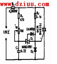 如圖為800W雙向可控調光器電路。該電路使用雙向開關MBS4991對雙向可控硅SCR進行相角控制。調節W可使SCR雙向可控硅導通角在0到170度變化。從而調節負載功率在滿功率的97%