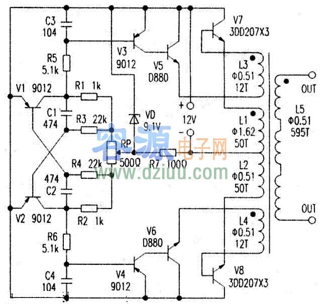 的集電極電流流經變壓器初級繞組L1、L2在變壓器的高壓側感應出約50Hz的準正弦波高壓輸出。元件選擇:本機的大多數元件都能從廢舊電路板中拆下來。V5、V6用D880或C2073。V7、V8分別用三只3DD207并聯而成,其參數為200V/5A/50W,也
