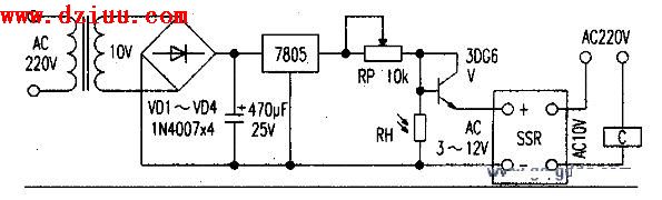 工作原理在附圖中,變壓器次級(jí)輸出10V電壓經(jīng)整流濾波后,途經(jīng)7805三端穩(wěn)壓器獲得+5V工作電壓。由光敏電阻RH和三極管3DG6及微調(diào)電阻RP組成光電開關(guān)。白天RH受光照呈低電阻,3DG6處于截止