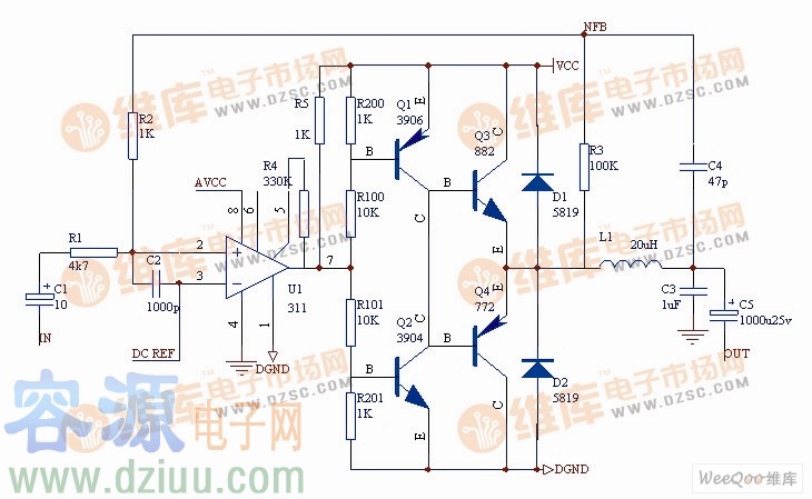 電源電壓:單電源9~24VDC(更高的沒試過)! ≥敵龉β剩24V時在4.3歐測試負載上最大可達10W,此時功耗約14W。 空載電流:40mA(12V),100mA(24V)! ≈C波失真:1KHz帶4.3歐測試負載,諧波失真成份主要是二