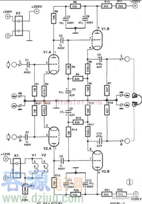 如圖所示電路,用雙三極管ECC82(相當于E802C、E82CC、與北美12AU7、國產6N10型)作為放大器。此類管子l有指標優良和使用壽命長的特點。前置放大器要產生足夠的信號幅度去驅動耳機。管腳1、2、3、的三極管部分放大