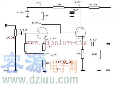 6N1是一只中μ雙三極管,μ=35,它具有R低、動態線性寬、頻率特性好、噪聲低等諸多優點,能承受較強信號輸入,并能給出足夠的輸出,既可用于電壓放大,又能用于倒相推動,在20世紀六七十年代可謂名噪一時,是各
