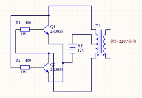 逆變器的制作原理圖如下圖所示,從這里我們可以看到使用到的器件有三極管2N3055,電阻,電源,還有一個(gè)變壓器,(還有開關(guān)在原理圖中沒畫出來,用來控制燈的亮滅)元件就這么多,電路也不算是復(fù)雜的。