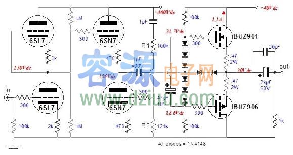 該6SL7提供了約35電壓增益,而6SN7提供了約800歐姆的輸出阻抗較低,
