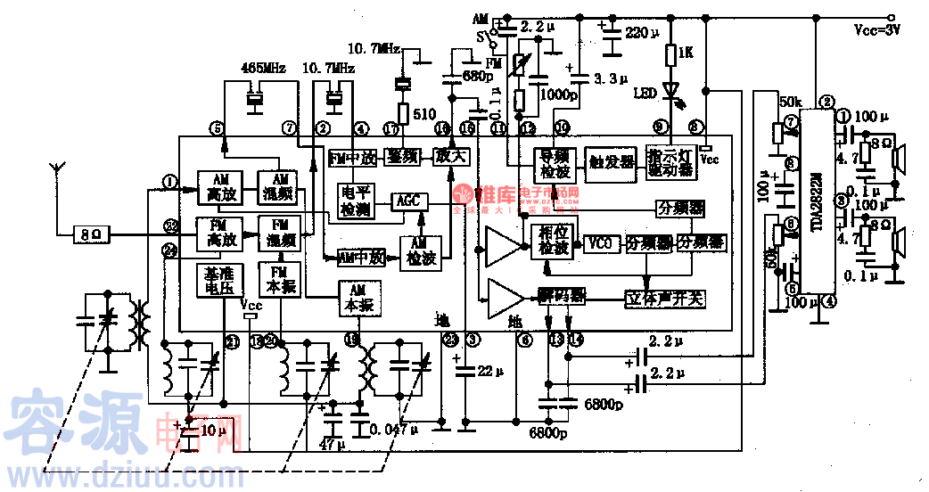 (l)FM波段。當開關(guān)S置于FM位置時,電路工作于FM狀態(tài),F(xiàn)M天線可用耳機的地線作天線以減小體積,此時FM信號從天線接收后通過帶通濾波器BPF輸入(24),經(jīng)高頻放大后,與(20)腳的FM 本振信號在內(nèi)部進行混頻,然后從(2)腳輸出,經(jīng)選頻電路選出10.7MHz的中頻信號后又從(4)腳輸入,再經(jīng)FM中放,鑒頻后從(6)腳輸出,由電容合到(15)腳進入立體聲解碼電路,解碼后的左、右聲道音頻信號分別從(13).(14)腳輸出,經(jīng)音量控制,TAD822功率放大后,去推動揚聲器發(fā)聲。