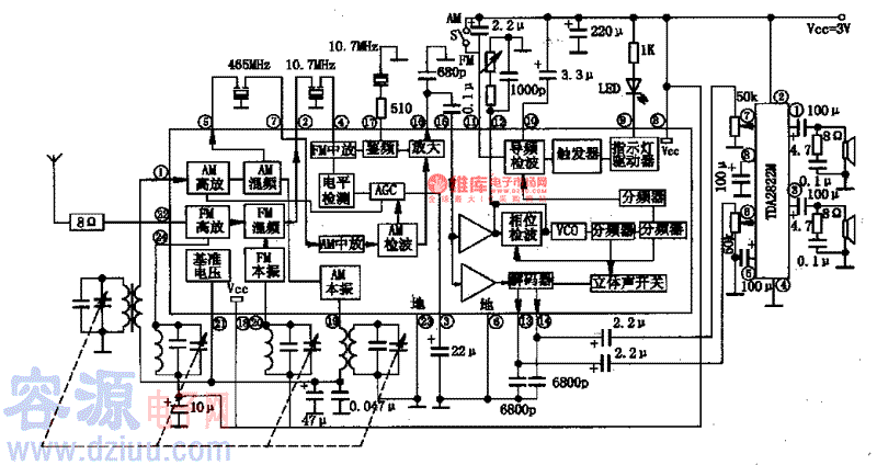 (l)FM波段。當開關S置于FM位置時,電路工作于FM狀態,FM天線可用耳機的地線作天線以減小體積,此時FM信號從天線接收后通過帶通濾波器BPF輸入(24),經高頻放大后,與(20)腳的FM 本振信號在內部進行混頻,然后從(2)腳輸出,經選頻電路選出10.7MHz的中頻信號后又從(4)腳輸入,再經FM中放,鑒頻后從(6)腳輸出,由電容合到(15)腳進入立體聲解碼電路,解碼后的左、右聲道音頻信號分別從(13).(14)腳輸出,經音量控制,TAD822功率放大后,去推動揚聲器發聲。