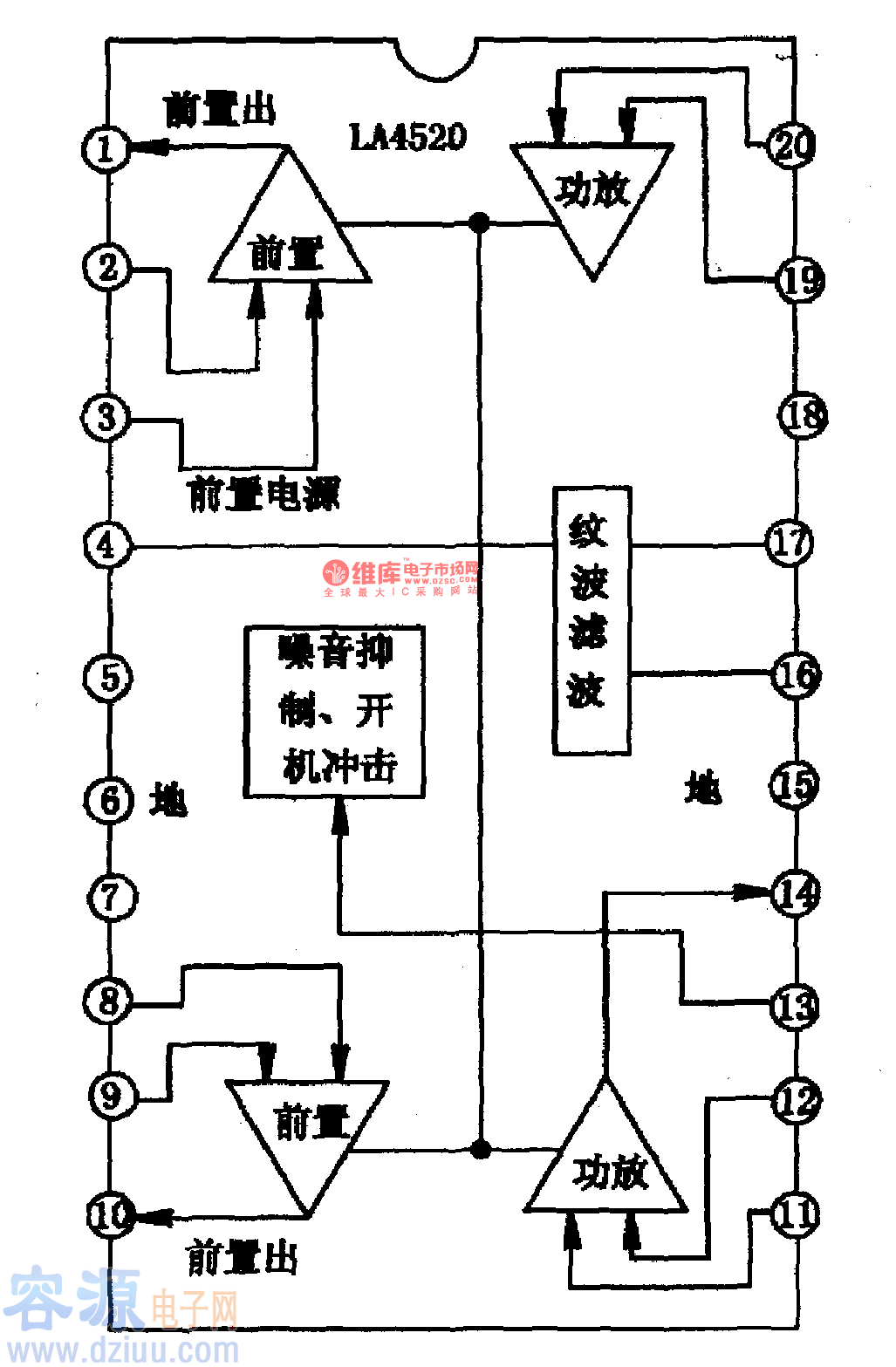 LA4570是日本三洋公司推出的放音機專用集成電路。國產、國內組裝或進口的單放機及收放機中,都應用LA4570的機型! 1·以4570內電路方框圖及引腳功能 LA4570集成塊是雙前置放大雙功放器件,具有電源電壓