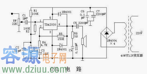 單電源供電音頻放大電路是典型應用電路, 由一塊TDA2030和較少元件組成單聲道音頻放大電路、裝置調整方便、性能指標好等突出的優點。特別是集成塊內部設計有完整的保護電路,能自我保護。