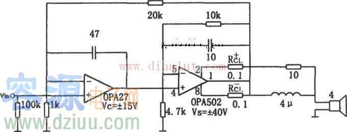 該高保真組合音響放大電路使用了超低噪聲精密運放OPA27作為前置放大。該電路最大輸出功率可達150W。OPA27采用同相輸入方式可提高其輸入阻抗,當電源電壓為±15V時,其輸出線性動態范圍±12V。當輸出功率為50W時