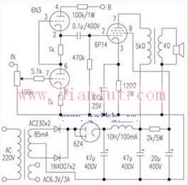 自制了一套音響,是將普及型的AM/FM汽車收放機從電位器前取出信號作音源,用6N3和6P14電子管作功放。老式的飛樂橢圓型喇叭加上一個簡易木盒子作音箱。功放電路見圖。 :