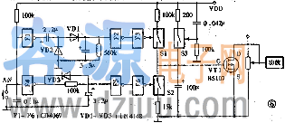 單按鈕音量控制器電路見圖6。VMOS管VT1作為一個可變電阻并接在音響裝置的音量電位器輸出端與地之間。VT1的D極和S極之間的電阻隨VGS成反比變化,因此控制VGS就可實現對音量大小的控制。VT1的G極接有3個模擬開關S