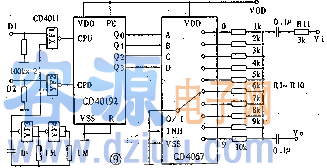 音量調節電路見圖9。音頻信號由Vi端輸入,經分壓電阻R11和隔直電容加到由R1~R10構成的加/減電阻網絡。CD40192為十進制加/減計數器,“與非”門YF3、YF4構成低頻振蕩器(低頻振蕩器是指產生頻率在0.1赫茲到10