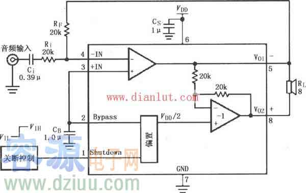 工作原理:音頻信號(hào)輸人后,經(jīng)過Ci、Ri耦合加到放大器的反相輸入端(4腳),而放大器的同相輸入端(3腳)則交流接地,放大后的信號(hào)從5、8腳輸出。5、8腳之間接負(fù)載,如揚(yáng)聲器,由此構(gòu)成反相功率放大電路。為了避
