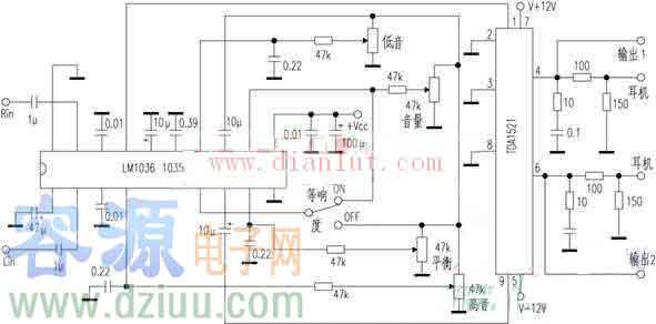 如圖所示是一款自制的用于多媒體的功放電路,圖中LM1036為直流音調控制IC,用于高低音、平衡、音量調節。功率放大為TDA1521,當供電電壓為±12V、8Ω負載時,即可獲得2×15W的輸出功率。電路采用萬用板焊接。須注