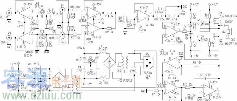 LF353的應用電路圖:甲類功放(A類功放)輸出級中兩個(或兩組)晶體管永遠處于導電狀態,也就是說不管有無訊號輸入它們都保持傳導電流,并使這兩個電流等于交流電的峰值,這時交流在最大訊號情況下流入負載.當無訊號時,兩個晶體管各流通等