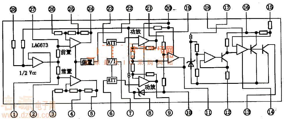 LAC673是日本米茲米公司(MITSVMI)生產的單片立體聲放音集成電路,在進口收放音隨身聽中應用較廣泛。 1.LAC673內框及引腳功能 LAC673集成塊內含雙前置放大、雙功放。直流電子音量控制電路,直流馬達穩速電