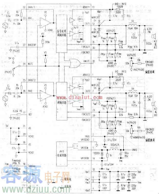 該器件輸出級以雙電源供電,電源電壓范圍為VPP:+23.6V-+36V;VNN;-22.4V—-36.6V。每個通道在4Ω負載上輸出可達100W功率。在25W時具有0.015%THD,60W時上升至0.1%。具備抑制開通。關斷噪聲、中點電壓調節、