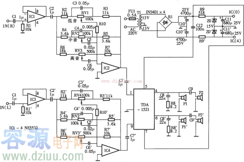 基于TDA1521的立體聲一體化有源音箱電路如圖。有源音箱是功放和無源音箱的有機結合體,在多媒體上得到廣泛應用。有源音箱省去功放外殼,節省空間,減少外接線路,省去與VCD等音源所重復的功能和電路(如卡拉OK電