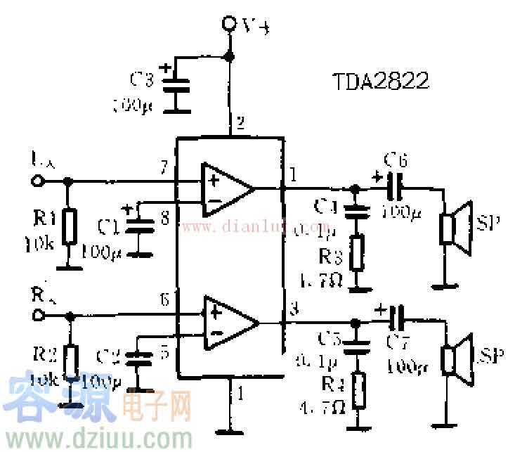 最簡單TDA2822功放電路圖:電路如圖所示。用一塊TDA2822M功放集成電路接成BTL方式,外圍元件只有一只電阻和兩只電容,不用裝散熱器,放音效果也令人滿意的。 集成電路TDA2822M為8腳雙列直插式封裝,R1的數(shù)值要求不拘,一般選用10k的碳