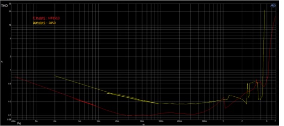 HT8513 對比2850輸出功率曲線:(VBAT=3.6V,RL=3Ω,防破音打開ACF)