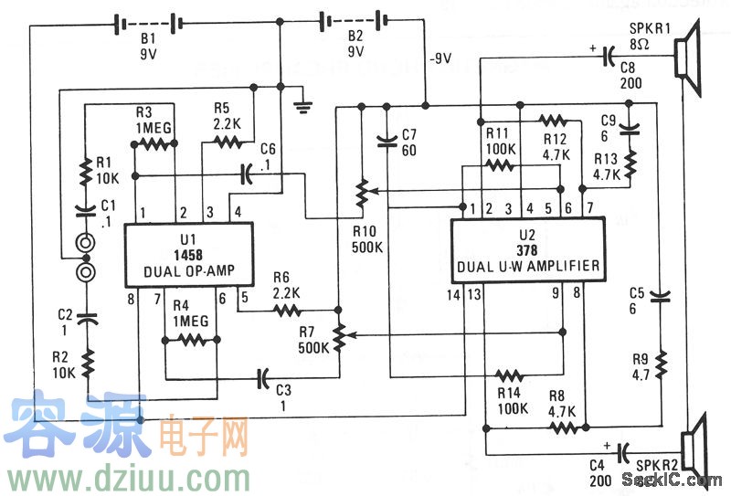 該電路圍繞2個芯片設置,一個是MC1458雙運放構成前置放大器,另一個為LM378雙4-watt放大器。前置放大器的增益由R3/R1獲得用于一側,另一側為R4/R2,大約為100。通過比率增加,增益隨之變化。 :