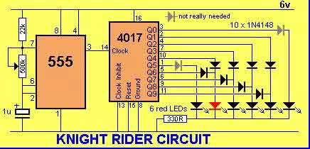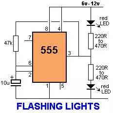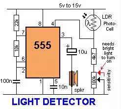 一個(gè)傳感器打開Q1來激活低頻555振蕩器,這會(huì)脈沖電燈I1。傳感器對(duì)于改變光線或者溫度是很敏感的。 :